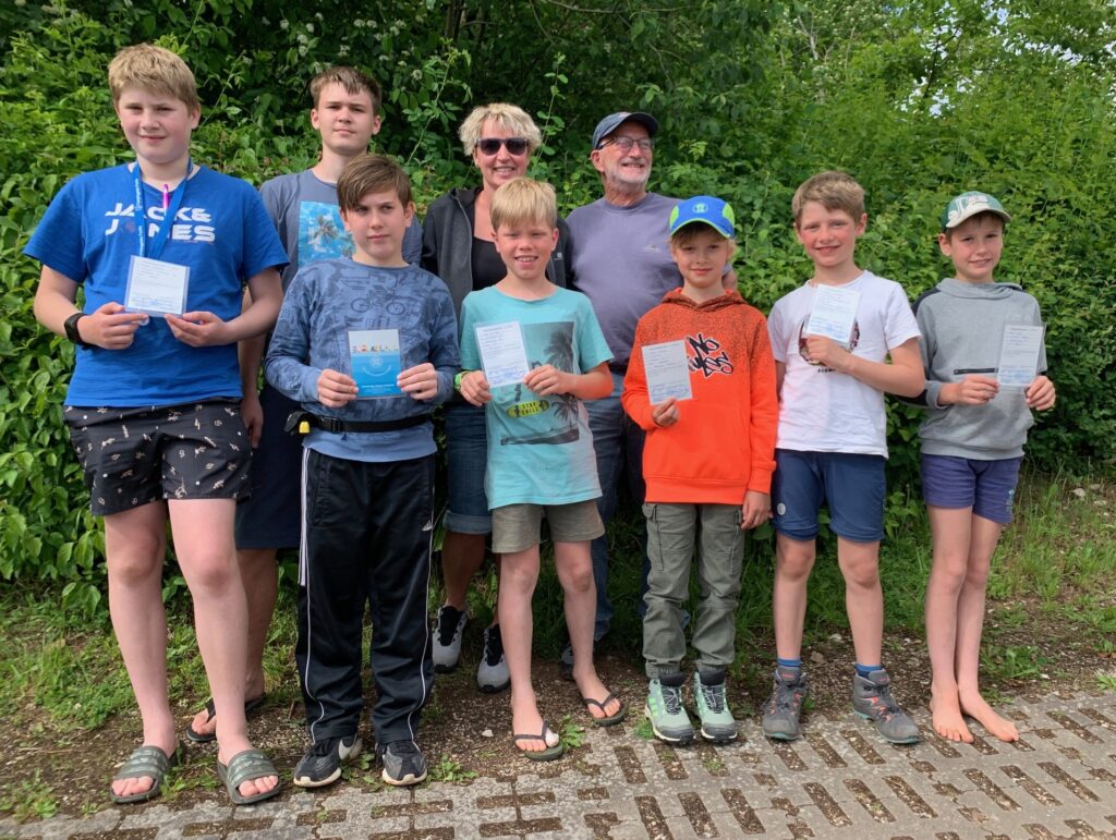 Sechs Kleinkapitäne im Alter von acht bis dreizehn Jahren meisterten an vier Tagen im Segelrevier des Marinevereins Heidenheim e.V. am Haselbachsee bei Ellwangen die Schulung und Prüfung des Jüngstensegelscheins des Deutschen Seglerverbandes. Ihre kleinen und leichten Jollen, der „Optimist“ ist ein klassisches Einstiegssegelboot für Kinder und Jugendliche. Dieses Boot ist klein, einhändig zu steuern und leicht zu erlernen – ideal für den Start in den Segelsport. Und den Spaßfaktor gab es gratis obendrauf!